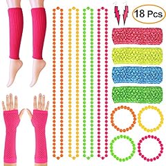 FEPITO 18 Pcs Neon Perlen Halsketten Armbänder Blitz Ohrringe Netzhandschuhe Neon Beinstulpen Dehnbare Stirnbänder Für 80er Jahre Kostüm, 80er Jahre Party Kostümzubehör