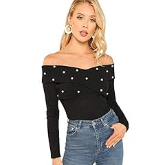 DIDK Damen Kreuz Vorn Schulterfrei T-Shirt Pullover Oberteile mit Perlen Wickeln Carmenausschnitt Langarmshirt Tops