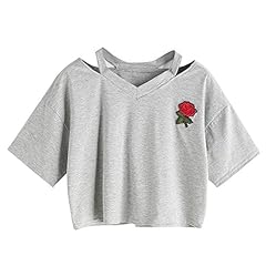 Oberteile Frauen Sommer, Ulanda Teenager Mädchen Mode Crop Top Sport V-Ausschnitt Shirt Bluse Damen Casual Rose Stickerei Kurzarm T-Shirts Hemd Tops Pullover Sale (Grau, M)