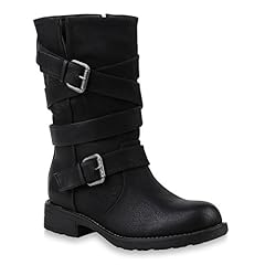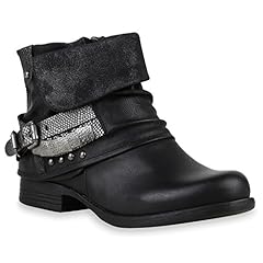 Stiefelparadies Damen Stiefeletten Biker Boots mit Blockabsatz Schnallen Nieten Flandell