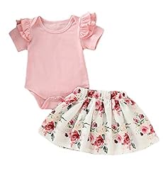 Infant Baby Mädchen Kleidung Set Kurzarm Rundhals Rose Print Strampler Rüschen Plissee Solid Color Rock Outfit Set 2 Stücke für 0-18 Monate (0-3 Monate, Rosa 2)
