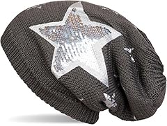 styleBREAKER warme Feinstrick Beanie Mütze mit All Over Vintage Stern Print, Pailletten Stern und sehr weichem Fleece Innenfutter, Unisex 04024091, Farbe:Dunkelgrau