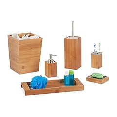 Relaxdays Bad Set, 6-teilig, Bambus, Seifenspender, Seifenhalter, Bürstenhalter, Zahnputzbecher, Ablage, Badeimer, Natur