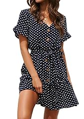 Sommerkleid Damen Kurzarm Elegant V-Ausschnitt Knopfleiste Polka Dot Kurze Strand Freizeitkleider mi Gürtel (1-Dot-Marine, Large)
