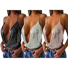 West See Damen Halter Top Tief V Crop Top Clubwaer Tragen Metall Pailletten Metal Nachtclub Tops Durchsichtig