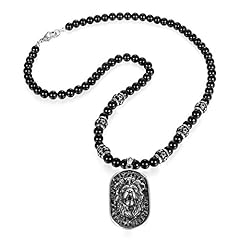 JewelryWe Schmuck Herren Biker Halskette, Edelstahl Gotik Punk Rock Löwe Kopf Dog Tag Anhänger mit Achat Onyx Perlen Kette Kugelkette, Schwarz Silber