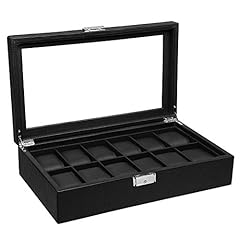 SONGMICS Uhrenbox mit 12 FÄchern, großer Uhrenkasten mit Glasdeckel, mit PU-Bezug, Samt-Innenfutter, Metallverschluss, tolles Geschenk fÜr die Liebsten, 36,2 x 9 x 21,3 cm, schwarz, JWB302H