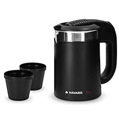 Navaris Edelstahl Reisewasserkocher 0,5L - mit 2 Trinkbechern - 16 x 11 x 17cm - Mini Reise-Wasserkocher 1100W für Camping - Reisekocher in Schwarz