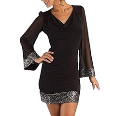 Btruely Kleid Damen Elegant Mädchen Chiffon Partykleid Lose Cocktailkleid Langarm Abenkleid Vintage Minikleid V-Ausschnitt Pailletten Kleid Böhmen Kleid (XL, Schwarz)