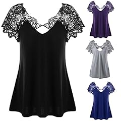 Zarupeng Spitze Kurzarm V-Ausschnitt T-Shirt, Damen Mode Oversize Patchwork Einfarbig Bluse Crop Tops Lose Jumper Oberteile Stretch Hemdbluse