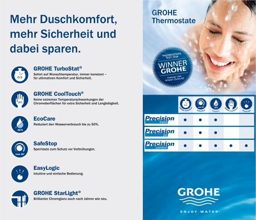 - Schutz vor zu heißen Temperaturen: Durch die Grohe CoolTouch Technologie wird Ihre Armatur niemals heißer als die von Ihnen eingestellte Wassertemperatur. Mit dieser Funktion schützen Sie insbesondere auch Ihre Kinder vor Verletzungen