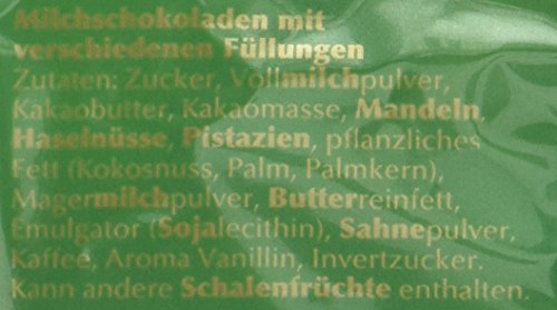 - Eine erlesene Mischung von Nuss-Kugeln: Pistazienkrokant in feiner Pistaziencrème, frisch geröstete Haselnüsse in feiner Nusscrème oder geröstete Mandeln in feiner Mandel-Haselnuss-Crème umhüllt von zarter Vollmilch-Chocolade.