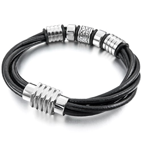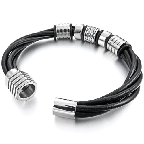 MunkiMix 9mm Edelstahl Echtleder Armband Armreifen Schwarz Silber Ton Magnet Schließe Verschluss Herren,Damen