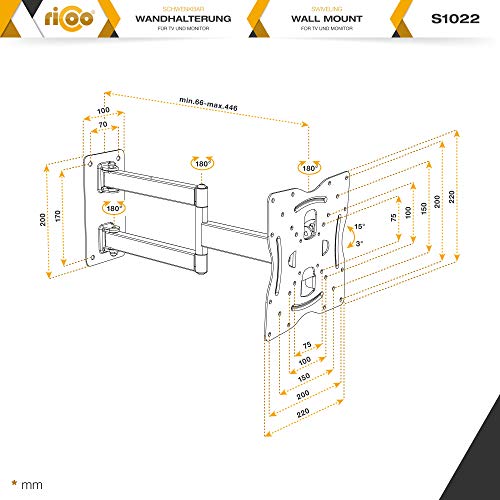 - ✅ FUNKTIONEN: Diese Fernseher-Halterung ist bis 180 Grad schwenkbar bei max Bildschirm-Breite von 76cm. Der Neige-Bereich liegt bei +15/-3 Grad. Der Wand-Abstand ist flexibel 66mm - 446mm