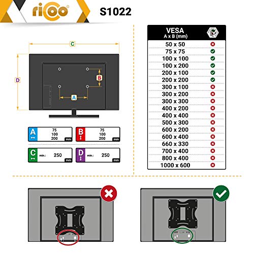 - ❗ BITTE BEACHTEN: Display-Diagonale nur Richtwert - wichtig sind: Position & Größe VESA-Norm, Bildschirm-Gewicht. Mitgelieferte Dübel nur für Massivbeton-Wände verwenden!