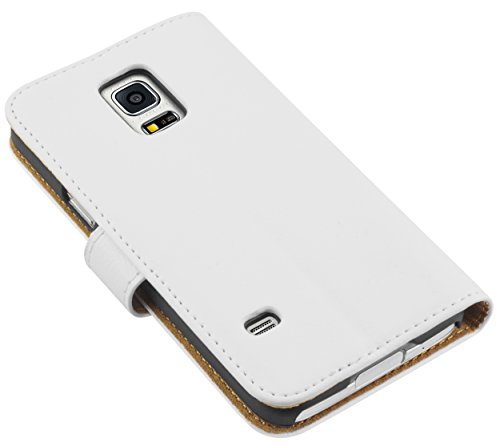 - 100% passgenau & Echt Leder: Die weisse Samsung Galaxy S5 mini Ledertasche. Lassen Sie sich von dem angenehm duftenden Leder der Handyhüllen für das S5 mini überzeugen. Mit Fächern für Karten, Führerschein etc. und praktischer Aufstellfunktion.