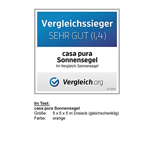- TESTSIEGER: Das wasserabweisende Sonnensegel von von casa pura wurde mit der Testnote 1.4 (sehr gut): ausgezeichnet als Vergleichssieger beim Sonnensegel-Test 03/2019 von vergleich.org