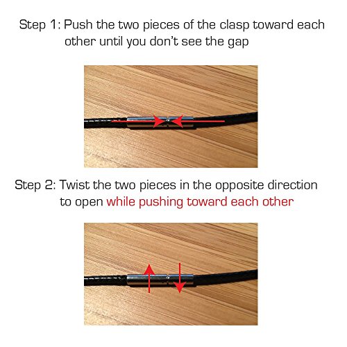 - To open the clasp, push the two pices of the clasp toward each other until there is no gap between them, then twist the two pieces in the opposite direction (While pushing them toward each other.