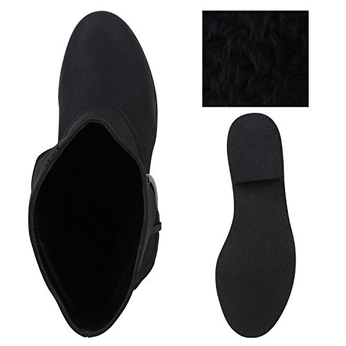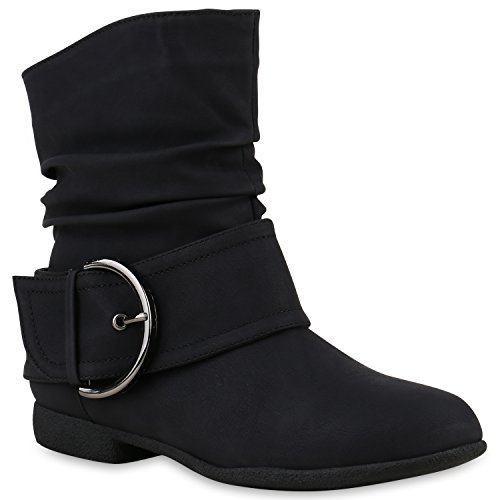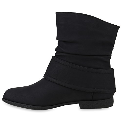 Damen Schlupfstiefel Wildleder-Optik Stiefel Schnallen Boots Stiefeletten Schuhe 122406 Schwarz 38 Flandell