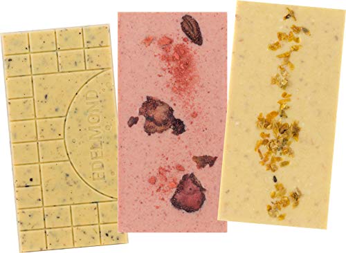 Edelmond Bio Weiße Schokolade Mini Set. Premium Schokoladen als geschmackvolles Geschenk, oder zum selbst genießen. Rohkostfrüche ohne künstliche Aromen