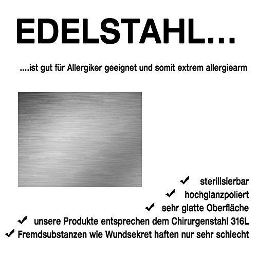 - ✔ EDELSTAHL ist nickelfrei und daher besonders gut für Allergiker geeignet und somit extrem allergiearm. Unsere Produkte entsprechen dem Chirurgenstahl 316L und sind hochglanzpoliert & sterilisierbar. Durch die glatte Oberfläche können Fremdsubstanzen wie Wundsekret nur sehr schlecht haften, wodurch Komplikationen während der Abheilung vermieden werden. Das Material Edelstahl ist für ein dauerhaftes und tägliches Tragen optimal geeignet und ist sehr belastbar im Alltag.