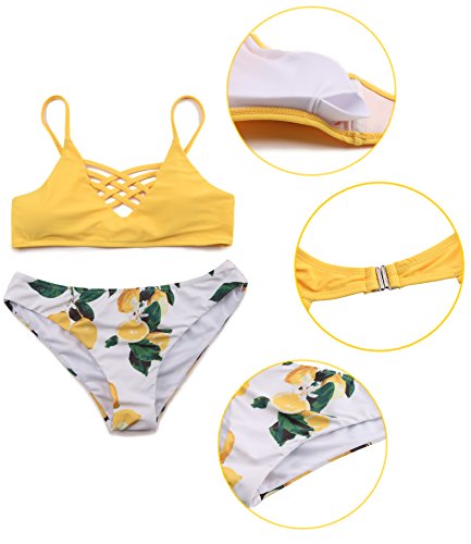 SHEKINI Damen Crossover Netz Gepolstert Bikini Set Zweiteilige Strandkleidung Bandeau Strandmode Blumen Druck Bikinihose (Large, Muster A: Gelb)