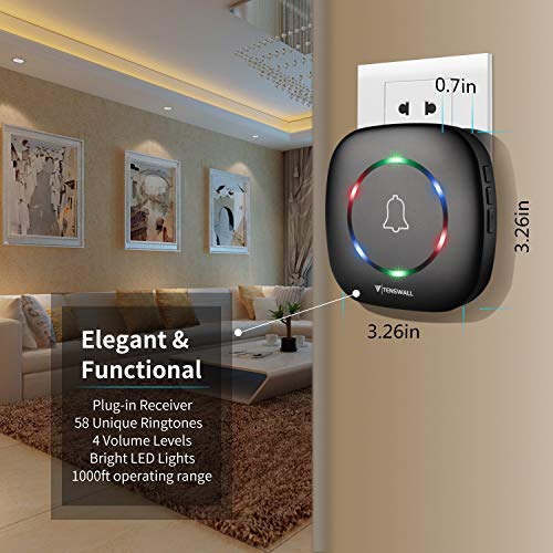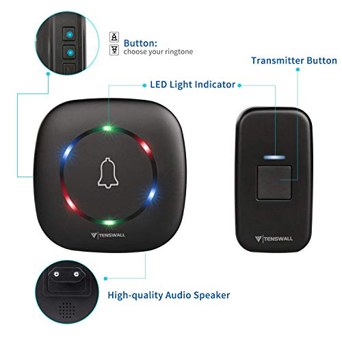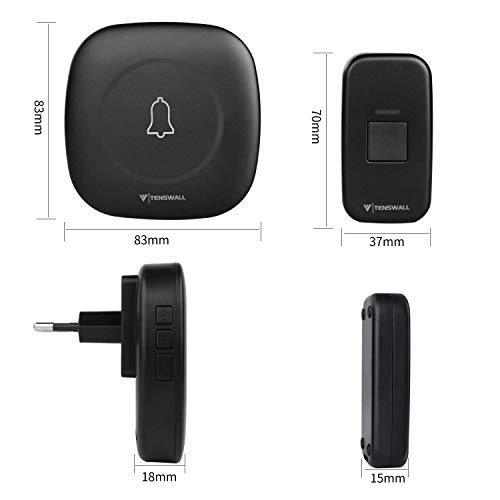 Tenswall Funkklingel drahtloses Türklingel, Funk-Türklingel mit 2 wassergeschütztem Klingelknopf und 2 Empfänger, wasserdicht IP55, 58 Klingeltöne, LED blinkt,Schwarz