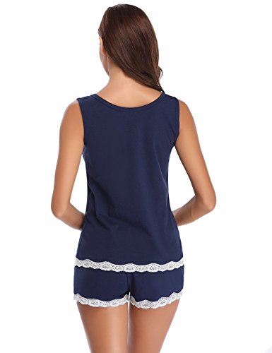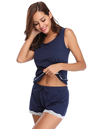 Hawiton Damen Schlafanzug Pyjama Kurz Baumwolle Nachtwäsche Sleepwear mit Spitze Tops und Shorts für Sommer