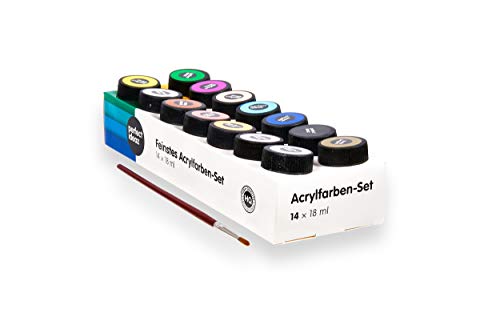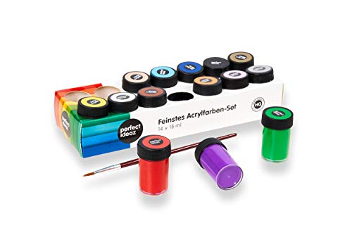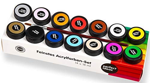 perfect ideaz 14 Töpfe á 18 ml Acryl-Farben-Set bunt mit Pinsel, 14 Basic & Metallic Kreativ-Farben, hoher Anteil an Farb-Pigmenten, acrylic paint hoch-deckend & schnell-trocknend zum Malen & Zeichnen